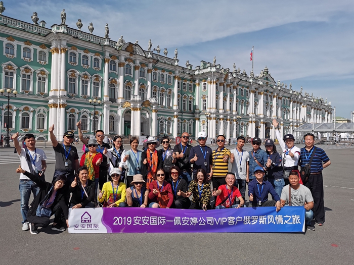 2019年5月15日-24日,安安國際?佩安婷衛(wèi)生用品實業(yè)有限公司組織VIP客戶暢游俄羅斯。 在百花盛開的五月,正是俄羅斯旅游觀光的好時節(jié)??蛻襞笥言趯?dǎo)游和領(lǐng)隊的帶領(lǐng)下,先后游覽觀光了莫斯科和圣彼得堡兩座美麗的城市,在莫斯科紅場、克里姆林宮,在圣彼得堡冬宮、夏宮和涅瓦河上撒下一路歡快的笑聲。